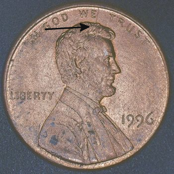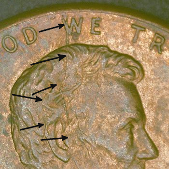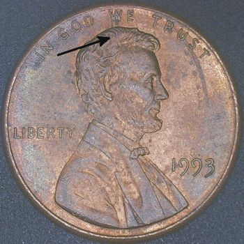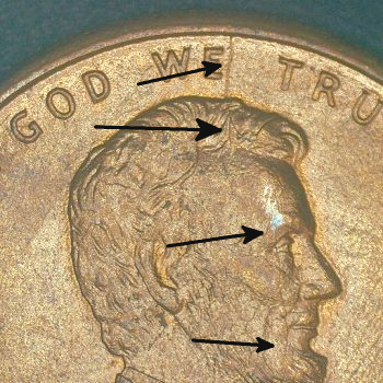 DIE MARKERS: OBVERSE –  Die Chip on top of Lincoln’s Head.
