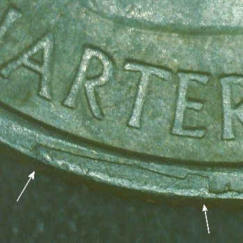 Cross reference: none. The die break (cud) has lengthened in this stage. Also noted is the retained cud (RCD-25c-2005P-01R(WV) which is seen in the upper right image above. This retained cud is seen in stage A as well.