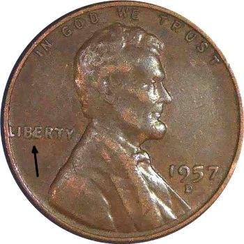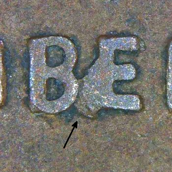 DIE MARKERS: OBVERSE –Die Chip bottom loop of “B” in LIBERTY