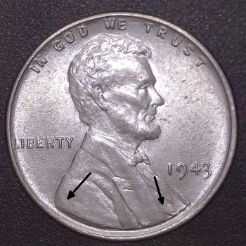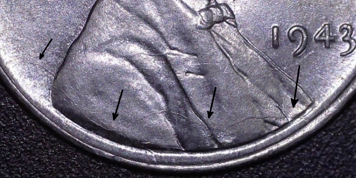Note: Die Crack on the bottom of Lincoln’s coat “white arrows”.