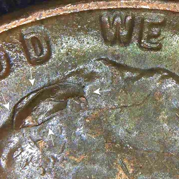 DIE MARKERS: OBVERSE – Die Crack “Spike Head” & Cud at “W” in “WE”.