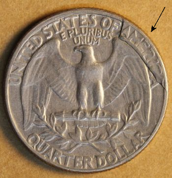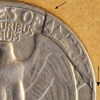 Care must be taken not to attribute this retained cud as a cud. Only faint letters from the words OF AMERICA will be seen on uncirculated coins. The cud formed later Washington Quarter Cuds; 1932 – 1999 : Cuds on Coins (cuds-on-coins.com).